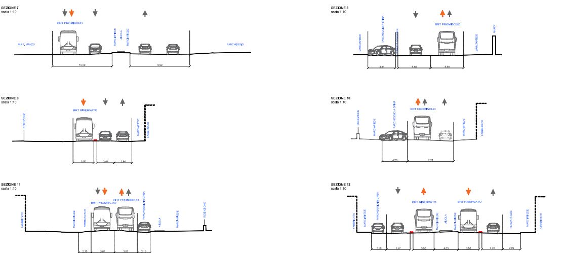 - Riposizionamento parcheggi: gli stalli blu saranno riposizionati parallelamente al marciapiede, liberando spazio per la corsia preferenziale.