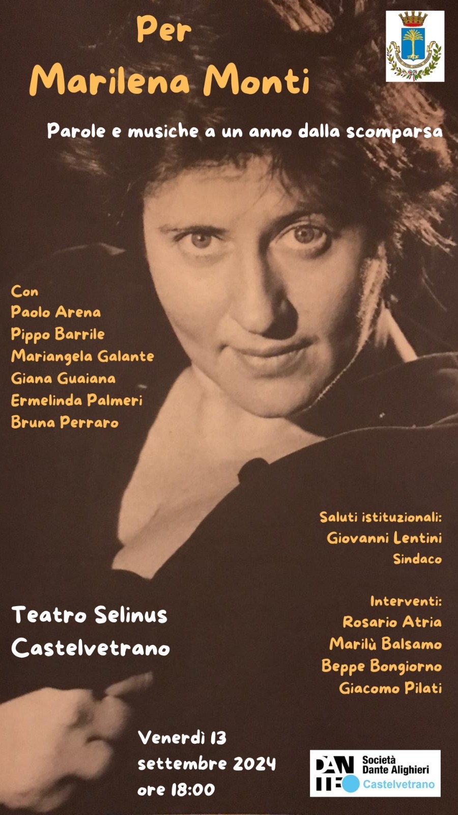 Si ricorda Marilena Monti al Teatro Selinus. Ad un anno dalla sua scomparsa, venerdì 13 settembre alle 18, la Società Dante Alighieri di Castelvetrano, insieme all’amministrazione comunale e al sindaco Giovanni Lentini, dedicano alla poliedrica scrittrice una serata commemorativa per ricordare il suo talento.