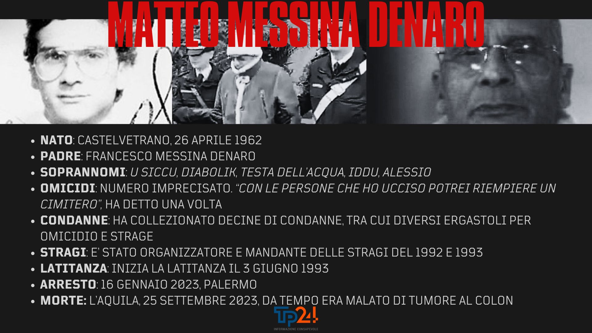 Dall'arresto alla morte Dopo il suo arresto, Messina Denaro è stato trasferito al carcere di massima sicurezza de L'Aquila, dove ha trascorso gli ultimi otto mesi della sua vita. Affetto da un grave tumore al colon, il boss ha ricevuto le cure mediche all'interno del penitenziario, ma le sue condizioni continuarono a peggiorare fino alla morte. Durante questo periodo, non collaborò con la giustizia e rifiutò di pentirsi, respingendo le accuse di appartenenza a Cosa Nostra e negando il suo coinvolgimento nelle stragi e negli omicidi.