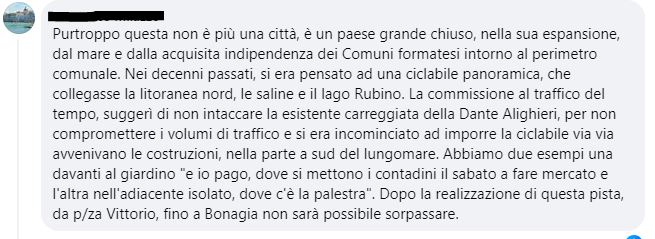 In passato si era ipotizzata una ciclabile panoramica che collegasse la litoranea nord, le saline e il lago Rubino, così come ricorda un utente in uno dei tanti dibattiti presenti sui social in cui si parla della ciclabile. "La commissione al traffico dell'epoca, però, optò per una soluzione meno invasiva, prevedendo la realizzazione della pista ciclabile in concomitanza con le nuove costruzioni nella zona sud del lungomare. Esempi di questo approccio sono i tratti di ciclabile già esistenti davanti" al mercato del contadino e all'altezza della vicina palestra. Senza considerare che "con la nuova pista ciclabile, da Piazza Vittorio fino a Bonagia, non sarà più possibile sorpassare".
