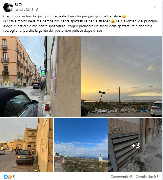 "Trapani bella, ma che schifo 'sta spazzatura!" Questo il grido d'allarme lanciato da Bi Ži, turista in visita nella nostra città, che, armata di Google Translate e smartphone, ha documentato con tanto di foto la situazione rifiuti nel centro storico.
