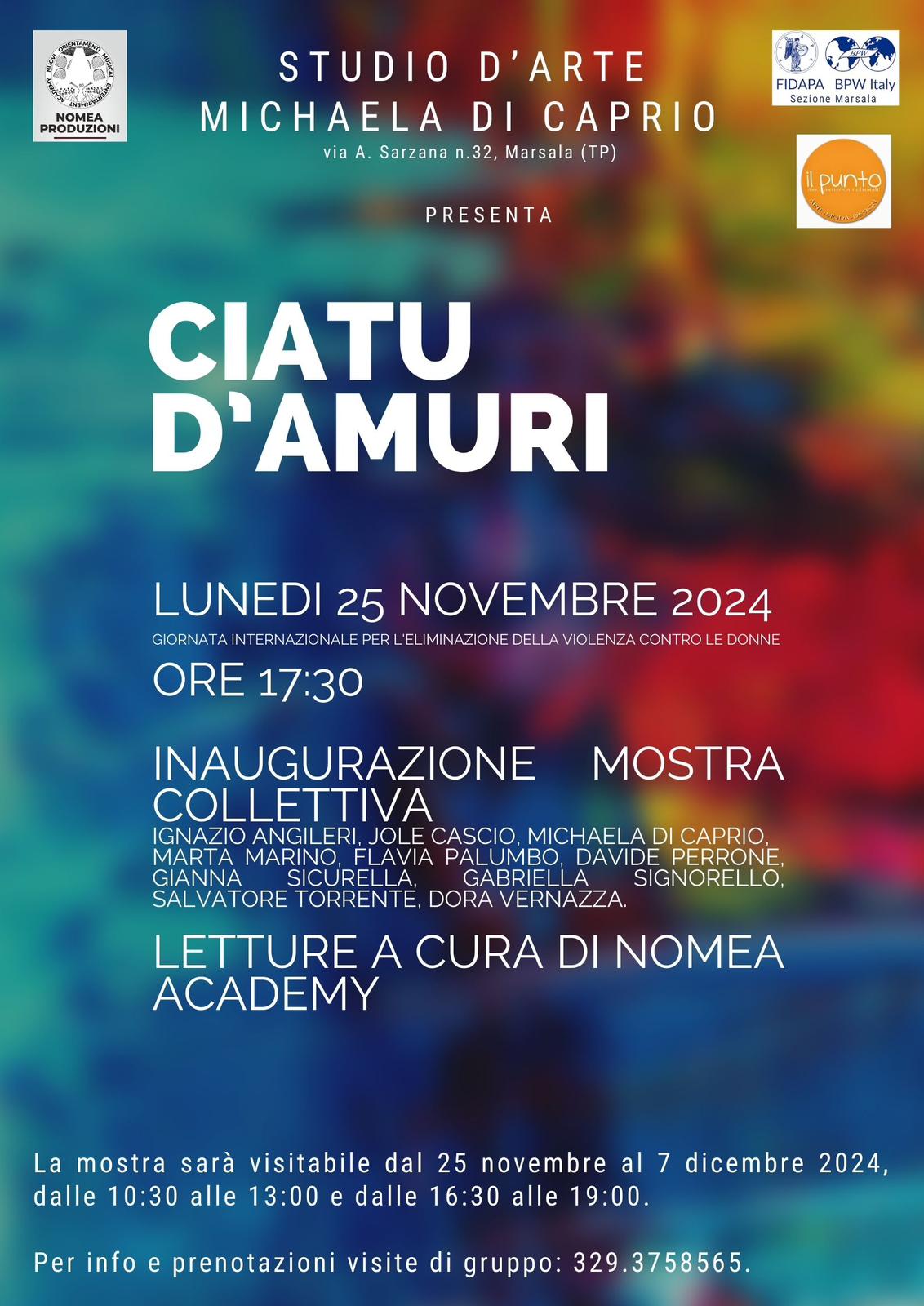 Marsala e il progetto “Ciatu d’amuri” - L’Associazione artistico-culturale “Il Punto” e Nomea Academy, in collaborazione con Fidapa Marsala, presentano l’iniziativa “Ciatu d’amuri”. Il 25 novembre, alle ore 17:30, sarà inaugurata una mostra collettiva con la partecipazione di artisti locali e un reading a cura di Nomea Academy. Questa iniziativa vuole offrire un momento di riflessione attraverso l’arte e il confronto, con azioni concrete di supporto per donne in difficoltà, come lezioni gratuite in settori creativi.