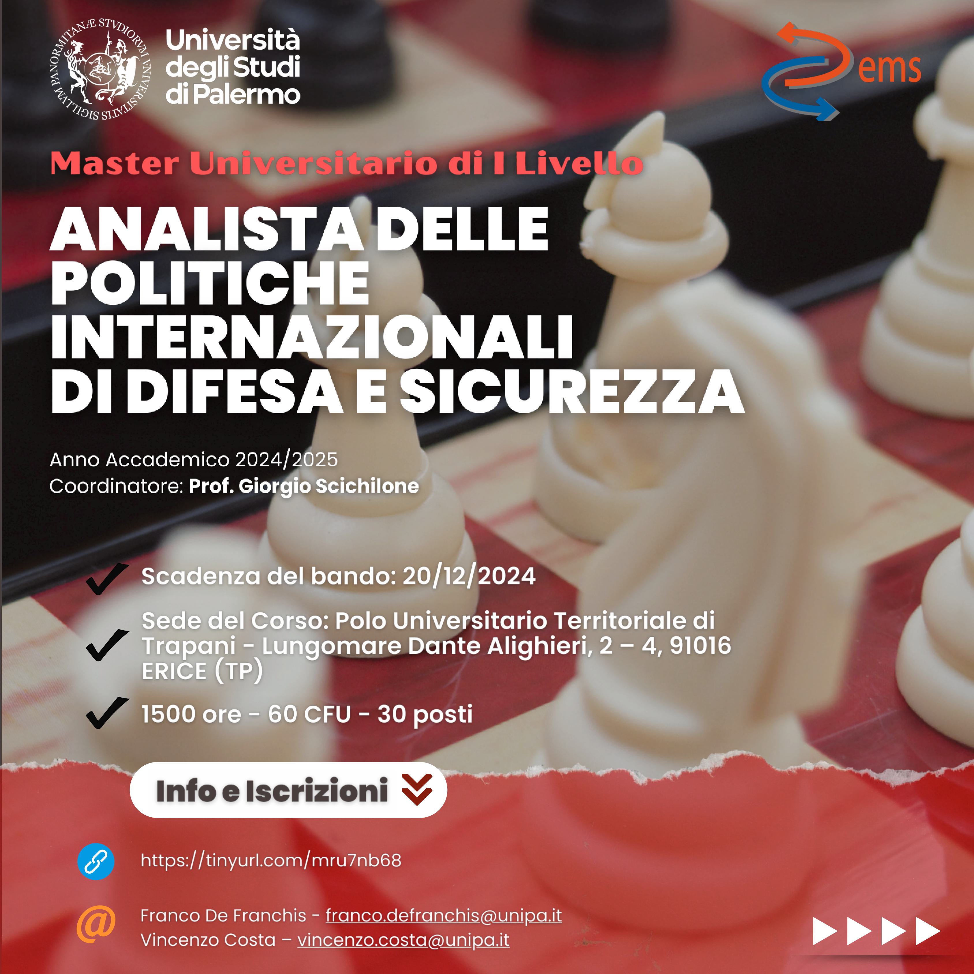 L’Università degli Studi di Palermo lancia a Trapani un’importante iniziativa accademica per l’anno accademico 2024/2025: il Master di I Livello in “Analista delle politiche internazionali di Difesa e Sicurezza”. Promosso dal Dipartimento di Scienze Politiche e delle Relazioni Internazionali (DEMS), il corso rappresenta un’occasione unica per approfondire le tematiche legate alla sicurezza nazionale e internazionale, alla cybersecurity e alle strategie di difesa. Un percorso formativo che unisce competenze politologiche, giuridiche e tecnologiche per formare professionisti pronti ad affrontare le sfide globali.