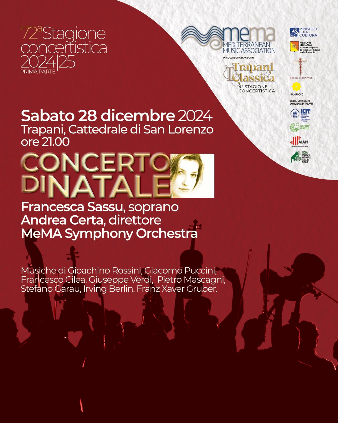 Sabato 28 dicembre, alle ore 21:00, la Cattedrale di Trapani ospiterà il tradizionale Concerto di Natale. Protagonista sarà la MEMA Symphony Orchestra, diretta da Andrea Certa, con la straordinaria partecipazione del soprano Francesca Sassu.
