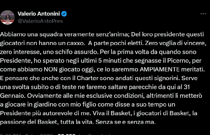 Abbiamo una squadra veramente senz’anima; Del loro presidente questi giocatori non hanno un caxxo. A parte pochi eletti. Zero voglia di vincere, zero interesse, uno schifo assurdo. Per la prima volta da quando sono Presidente, ho sperato negli ultimi 5 minuti che segnasse il Picerno, per come abbiamo NON giocato oggi, ce lo saremmo AMPIAMENTE meritati. E pensare che anche con il Charter sono andati questi signorini. Serve una svolta subito o di teste ne faremo saltare parecchie da qui al 31 Gennaio. Ovviamente alle mie esclusive condizioni, altrimenti li metterò a giocare in giardino con mio figlio come disse a suo tempo un Presidente più autorevole di me. Viva il Basket, i giocatori di Basket, la passione del Basket, tutta la vita. Senza se e senza ma.