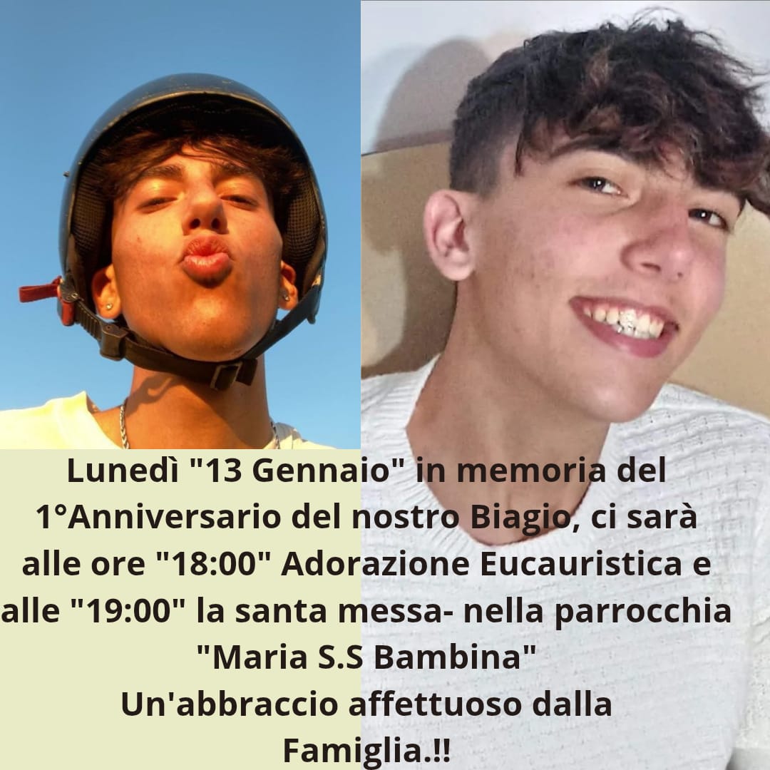 Per commemorare il primo anniversario della sua scomparsa, lunedì 13 gennaio, nella parrocchia di Maria SS. Bambina, si terrà alle ore 18:00 l’Adorazione Eucaristica, seguita alle 19:00 dalla Santa Messa in suffragio di Biagio. L’intera comunità è invitata a partecipare per ricordare un ragazzo che ha lasciato un segno profondo nei cuori di chi lo ha conosciuto.