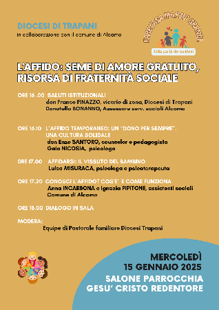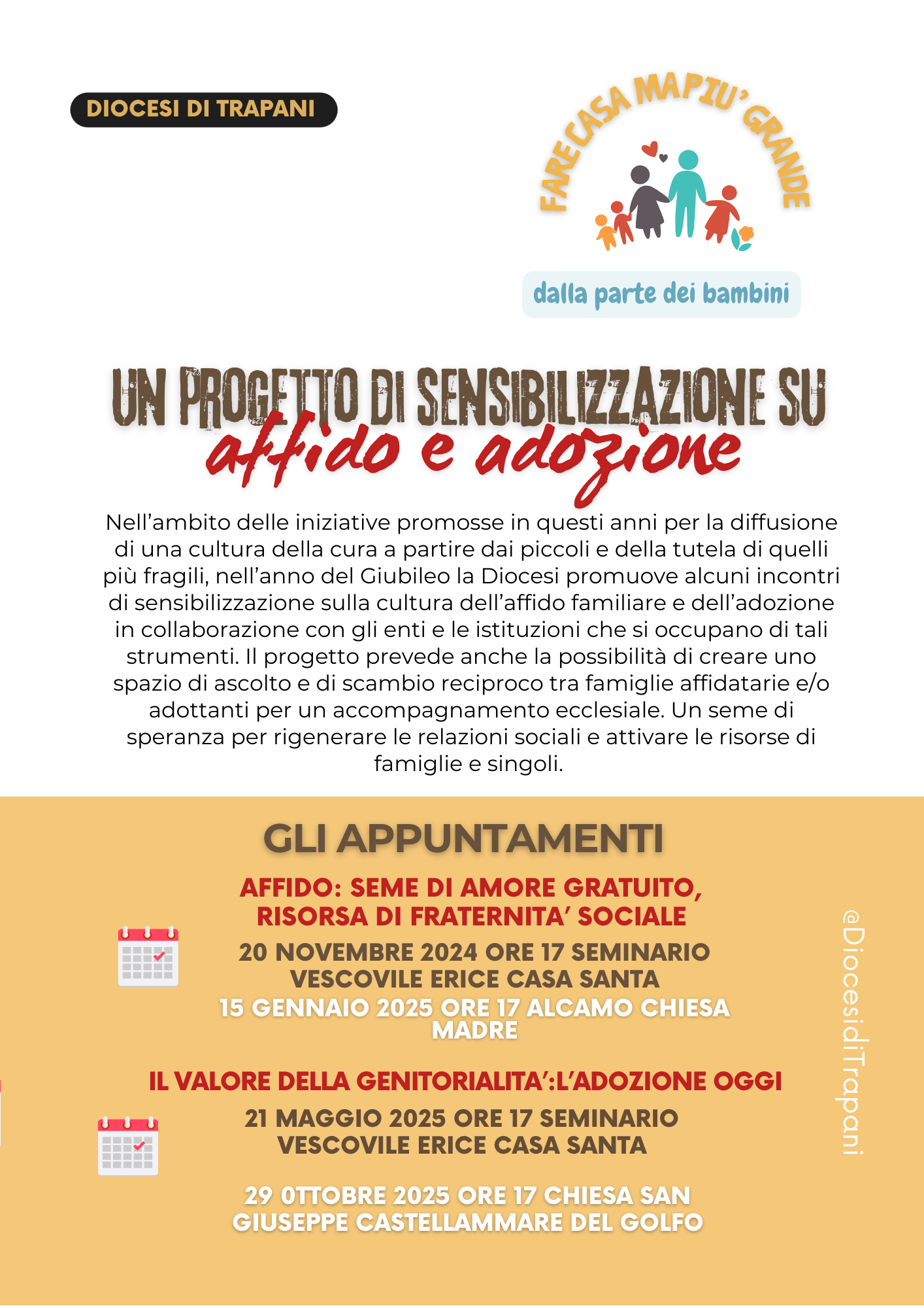 Mercoledì 15 gennaio, presso il salone della Chiesa Gesù Cristo Redentore di Alcamo, si terrà il secondo incontro del progetto “Fare casa ma più grande, a partire dai bambini”, un’iniziativa promossa dalla Diocesi per sensibilizzare e informare la comunità sull’importanza dell’affido familiare e dell’adozione.