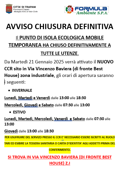 È stato inaugurato ieri, alla presenza del sindaco Giacomo Tranchida e dell'assessore all'Ambiente Emanuele Barbara, il nuovo Centro Comunale di Raccolta (CCR) di Trapani, situato in zona industriale. L'impianto, realizzato con un investimento di 1,7 milioni di euro, rappresenta un passo importante per la città nella gestione dei rifiuti, con l'obiettivo di migliorare la raccolta differenziata e contrastare il fenomeno delle discariche abusive.
