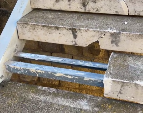"Ecco in che condizioni i turisti trovano la scala per accedere, dice Passalacqua. La ringhiera non è sicura: mancano i cavi d'acciaio. Gli scalini in marmo sono staccati dalla struttura in ferro. Addirittura manca uno scalino: è stato divelto e si è staccato, creando uno spazio pericoloso in cui un bambino o anche un adulto potrebbero farsi male".