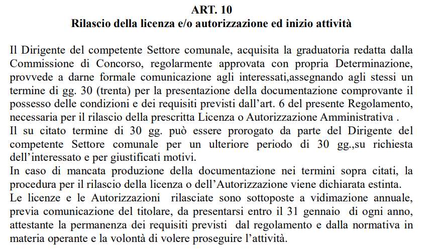 Ecco cosa riporta l'articolo 10 del Regolamento comunale per il servizio taxi e di noleggio con conducente: