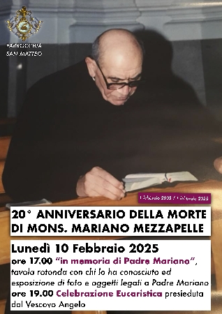 Lunedì 10 febbraio, alle ore 17, presso la chiesa parrocchiale San Matteo di Marsala, si terrà un momento celebrativo in ricordo di Monsignor Mariano Mezzapelle, nel ventesimo anniversario della sua scomparsa. L’evento, organizzato dal parroco don Alessandro Palermo, vuole essere un’occasione per ricordare e onorare la figura di un sacerdote che ha lasciato un’impronta profonda nella comunità parrocchiale e nella città di Marsala.