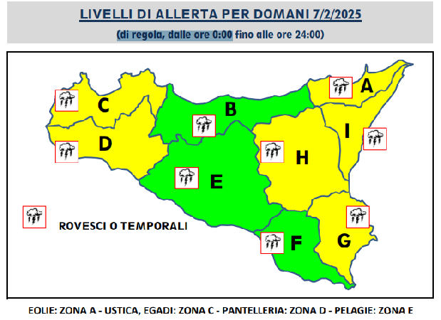 La Protezione Civile regionale ha diramato un’allerta meteo gialla per oggi, venerdì 7 febbraio, su Trapani, parte del Palermitano e tutta la Sicilia orientale. La giornata sarà caratterizzata da piogge sparse, temporali e venti forti di scirocco, con mari molto mossi nello Stretto di Sicilia, sullo Ionio e nel Tirreno centromeridionale.