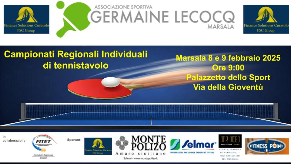 Non si spengono gli echi della vittoria, nel recente Campionato Giovanile di Catania, con il primo posto di Federico Bellissimo nella categoria Under 13/15 e l’ottimo quarto posto nella categoria Under 21 per Giovanni Altesi che, sabato 8 e domenica 9 febbraio, al Palazzetto dello Sport di Marsala, la Germaine Lecocq in collaborazione con il Comitato Regionale Fitet, è chiamata ad organizzare i Campionati Regionali individuali di Tennis Tavolo. Una manifestazione che sugella l’ottima stagione del sodalizio lilibetano impegnato in diversi Campionati, dalla B2 nazionale alla D2 regionale e soprattutto nel Campionato Paralimpico in cui i pongisti marsalesi stanno dimostrando l’ottimo livello raggiunto nei campi di tutta Italia. Per l’annuale appuntamento si attendono a Marsala i migliori giocatori siciliani che si sfideranno per il ranking individuale maschile e femminile e per il doppio, prima volta in assoluto, che si giocherà a gironi.
