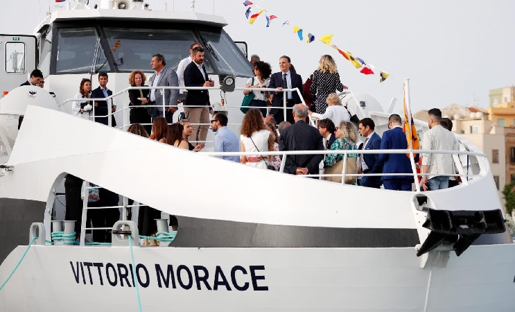 Il monocarena Vittorio Morace è la prima delle 9 innovative navi ibride veloci ordinate da Liberty Lines, capace di navigare in modalità totalmente elettrica ad una velocità di 10 nodi per circa mezz’ora in prossimità della costa e poi ricaricare le batterie durante la navigazione in mare aperto quando l’unità è spinta dai motori termici e raggiunge velocità superiori ai 30 nodi.
