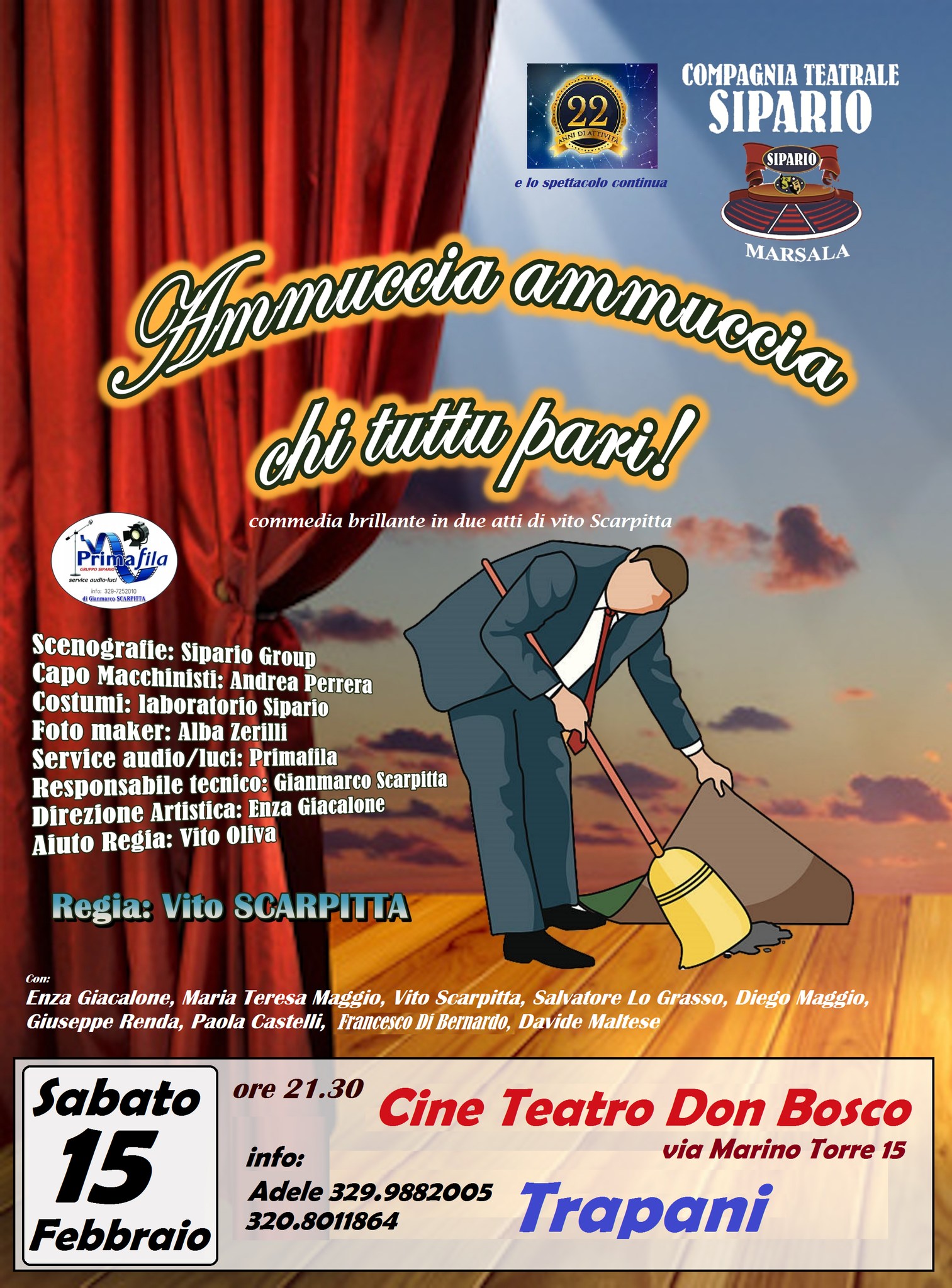 TRAPANI - Sabato 15 febbraio, alle ore 21:30, al Cine Teatro Don Bosco, andrà in scena la commedia "Ammuccia ammuccia chi tuttu pari!", scritta e diretta da Vito Scarpitta. Lo spettacolo è prodotto dalla Compagnia Teatrale Sipario di Marsala. Info e prenotazioni: 329.9882005 – 320.8011864.