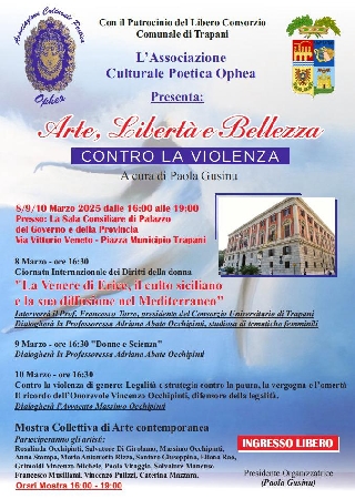 Trapani si prepara ad accogliere un evento straordinario, un'esplosione di creatività e impegno civile: "Arte, Libertà e Bellezza contro la violenza", un'iniziativa dell'Associazione culturale poetica Ophea, con il patrocinio del Libero consorzio comunale di Trapani.