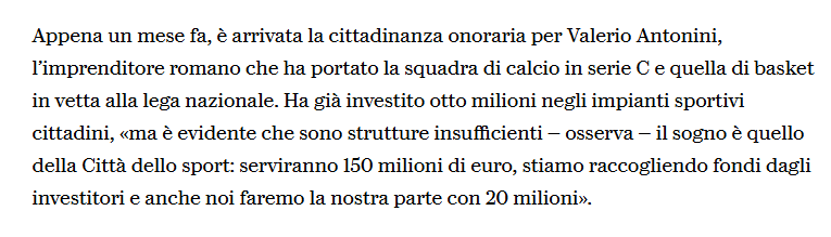 Il 28 Dicembre 2024, ad esempio, dichiara a La Repubblica, «Nell'ultima settimana di settembre – dice l'imprenditore romano presidente della squadre di calcio e di basket di Trapani – partiranno i lavori per la realizzazione della cittadella dello sport di Trapani. Un progetto con un investimento tra gli 85 e i 95 milioni, la cui realizzazione andrà avanti per due anni».