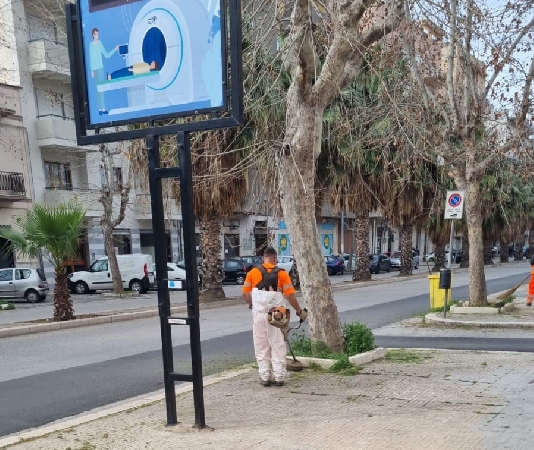 operatori della manutenzione del verde operano nella via Piersanti Mattarella in totale dispregio delle norme di sicurezza personale sul lavoro (operatore di decespugliatore) e di sicurezza dei terzi messi a rischio dalla proiezione di materiali diversi generati dal veloce movimento rotatorio del decespugliatore. Nessuna fascia protettiva circolare di protezione rispetto al decespugliatore in opera. Niente casco di protezione, protezioni occhi, protezione della zona di lavoro".