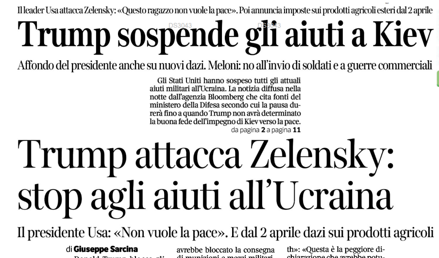 Trump sospende gli aiuti militari all’Ucraina: La decisione congela i fondi fino a data da destinarsi. Gli esperti militari stimano che, senza il supporto statunitense, Kiev potrà resistere per non più di sei mesi.