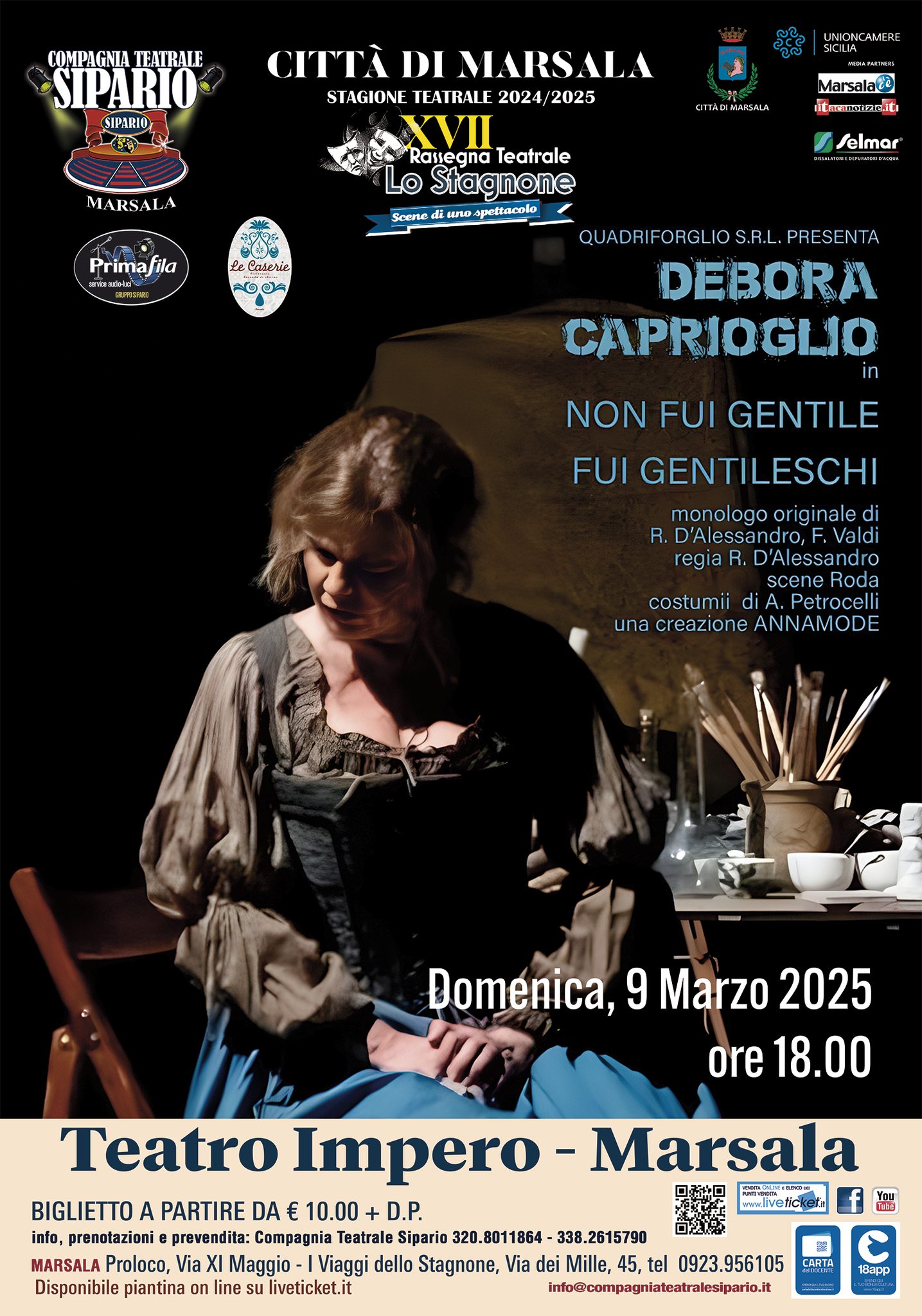 MARSALA - Il 9 marzo, alle ore 18:00, il Teatro Impero ospiterà lo spettacolo teatrale "Non fui gentile fui Gentileschi", interpretato da Debora Caprioglio. L’evento, parte della XVII edizione della Rassegna Teatrale Lo Stagnone, prevede un ingresso a partire da 10 euro.