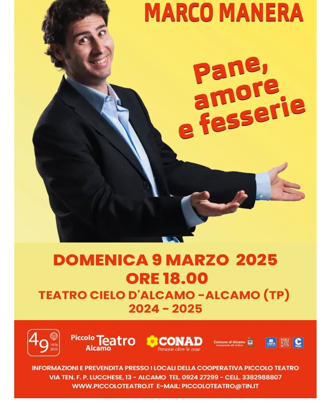 ALCAMO - Domenica 9 marzo alle 18:00, il Teatro Cielo D'Alcamo ospiterà il monologo comico "Pane, Amore e Fesserie" scritto e interpretato da Marco Manera. L’evento fa parte della XL Rassegna della Prosa e dello Spettacolo di Alcamo.