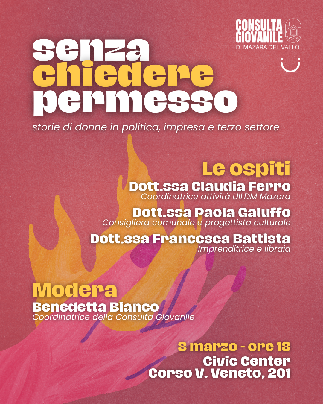 Mazara - Senza chiedere permesso. Storie di donne in politica, impresa e terzo settore". In occasione della Giornata Internazionale della Donna, la Consulta Giovanile di Mazara del Vallo organizza la conferenza "Senza chiedere permesso", un evento dedicato al confronto e alla riflessione sul ruolo delle donne in politica, impresa e nel terzo settore. L’incontro si terrà sabato 8 marzo 2025, alle ore 18:00, presso il Civic Center in Corso V. Veneto 201. L’incontro sarà un’occasione per riflettere sul ruolo delle donne nei diversi ambiti della società, con l’obiettivo di ispirare e promuovere una maggiore consapevolezza sull’empowerment femminile attraverso storie di successo e determinazione. Le ospiti della serata saranno: la Dott.ssa Claudia Ferro, coordinatrice attività UILDM Mazara; la Dott.ssa Paola Galuffo, consigliera comunale e progettista culturale; la Dott.ssa Francesca Battista, imprenditrice e libraia. A moderare il dibattito sarà Benedetta Bianco, coordinatrice della Consulta Giovanile di Mazara del Vallo. L’ingresso è libero e l’evento è aperto a tutte e tutti.