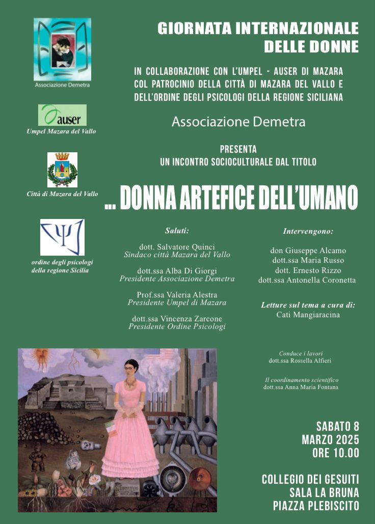 "... Donna artefice dell'umano" - In occasione della Giornata Internazionale della Donna, oggi con inizio alle ore 10 nella Sala La Bruna del Collegio dei Gesuiti si svolgerà l'incontro socio-culturale dal titolo "... Donna artefice dell'umano". L'incontro è organizzato dall'Associazione Demetra di Mazara del Vallo in collaborazione con l'Università Mazarese dell'Età Libera (Umpel aderente all'Auser) ed i patrocini del Comune di Mazara del Vallo e dell'Ordine degli Psicologi della Regione Siciliana. Gli enti organizzatori e patrocinanti apriranno l'incontro con i saluti del sindaco Salvatore Quinci, del presidente dell'associazione Demetra Alba Di Giorgi, della presidente Umpel Valeria Alestra e del presidente dell'Ordine regionale degli psicologi Vincenza Zarcone. Interverranno: don Giuseppe Alcamo, docente di Teologia dell'Università Lumsa e Parroco di San Lorenzo, la psicologa Maria Russo, lo psichiatra Ernesto Rizzo e Antonella Coronetta, consigliere comunale ed educatrice professionale.