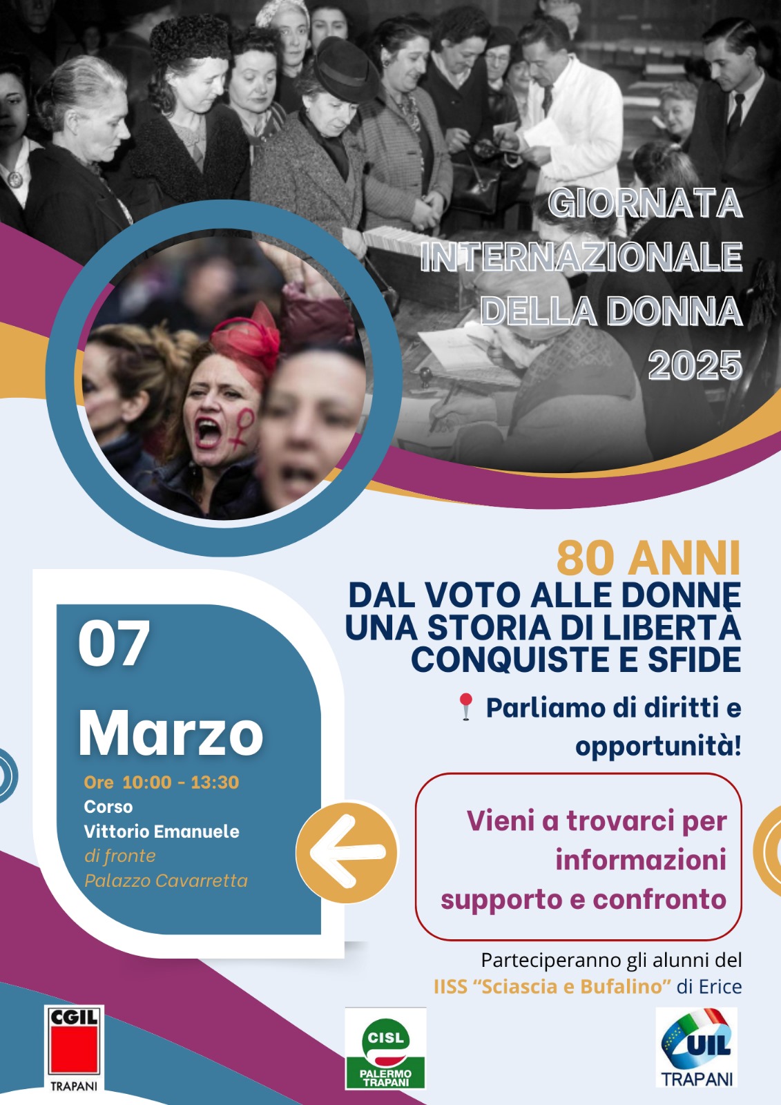 CGIl CISL UIL - A Trapani un confronto sulle pari opportunità - Venerdì 14 marzo 2025, in Corso Vittorio Emanuele a Trapani, CGIL, CISL e UIL hanno promosso l’evento “80 anni. Dal voto alle donne: una storia di libertà, conquiste e sfide”, riflettendo sul percorso dall’estensione del suffragio femminile (1945) alle sfide attuali per la parità di genere. L’iniziativa, con un banchetto informativo davanti a Palazzo Cavarretta, ha coinvolto cittadini e studenti, tra cui quelli dell’IIS “Sciascia e Bufalino” di Erice, autori di un elaborato sull’8 marzo e l’emancipazione femminile.