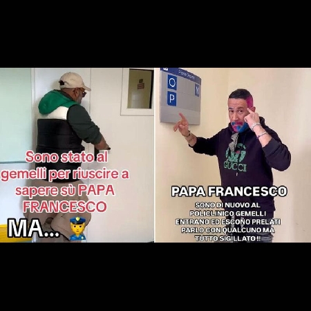 Due tiktoker complottisti, Er Bombolino e L’Ottavo Re di Roma, sono entrati al policlinico Gemelli per provare a dimostrare che il Papa è morto e il Vaticano diffonde menzogne. Scrive Open: «Ottavo arriva di fronte alla porta di un corridoio. “Non c’è nessuna scorta. Niente di niente. Non sarei mai riuscito ad accedere fino a qui se lui fosse qui. Per questo, vi dico, a mio avviso, Papa Francesco non c’è più”. Ottavo ci prova un’altra volta e incontra una suora, che preferisce non parlare con lui. Il segno, sostiene l’uomo, è inequivocabile: “Sono riuniti per capire come darci la notizia della morte”».