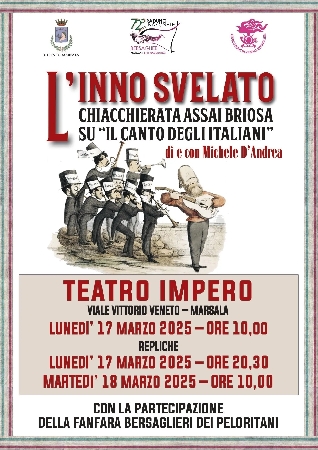 Uno degli eventi più attesi di questo percorso culturale sarà lo spettacolo “L’Inno Svelato”, una chiacchierata briosa e coinvolgente su “Il Canto degli Italiani”, in compagnia di Michele D’Andrea. e con la partecipazione della Fanfara dei Bersaglieri dei Peloritani. L'evento si terrà lunedì 17 marzo 2025 al Teatro Impero di Marsala, alle ore 10:00 (prima rappresentazione) e alle ore 20:30 (replica serale). Martedì 18 marzo 2025 – ore 10:00 (seconda replica). Un appuntamento per scoprire i segreti e le curiosità dell’inno nazionale italiano, un vero simbolo di unità e identità del Paese, raccontato con passione e competenza da uno dei maggiori esperti della sua storia.