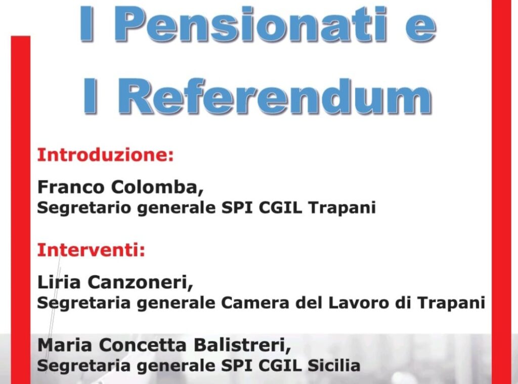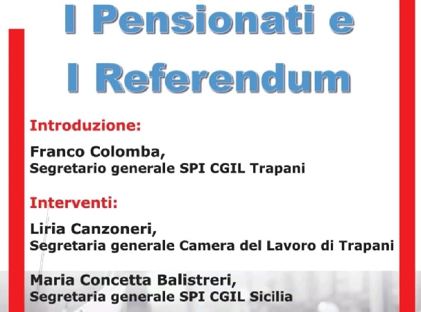 "I pensionati e il referendum" è il tema dell'iniziativa che lo Spi Cgil di Trapani terrà domattina all'Hotel President, in via Nino Bixio 1, a Marsala.