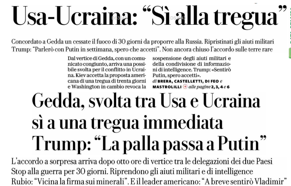 Tregua in Ucraina: Kiev ha accettato un cessate il fuoco immediato di 30 giorni, rinnovabili. Ora si attende la risposta della Russia. Steve Witkoff, inviato di Trump, sarà domani a Mosca per convincere Putin a firmare l’accordo.