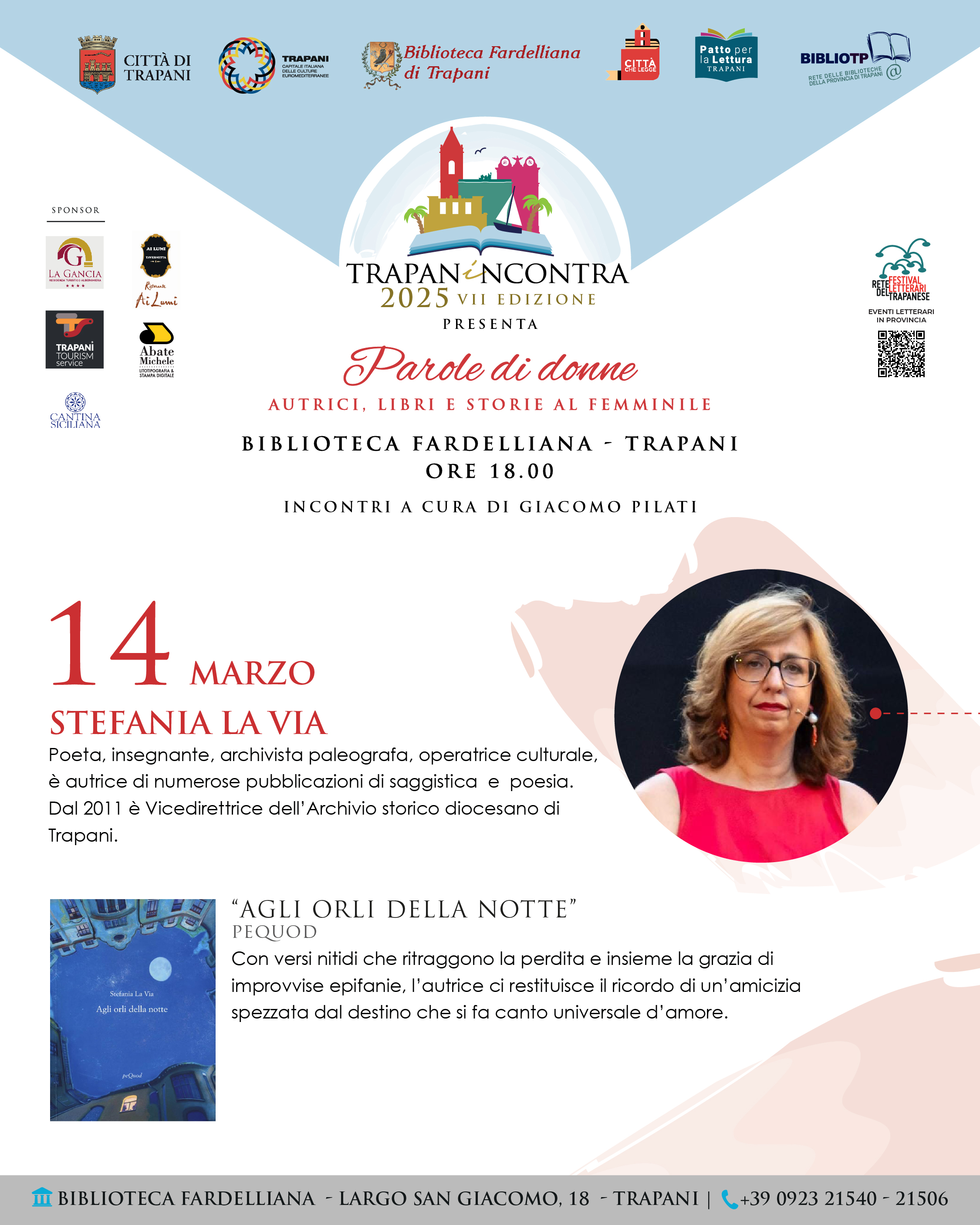 Venerdì 14 marzo alle ore 18:00, la Biblioteca Fardelliana di Trapani ospiterà Stefania La Via, insegnante, poeta e vicedirettrice dell'archivio storico diocesano di Trapani, che presenterà la sua raccolta poetica "Agli orli della notte", pubblicata da Pequod.