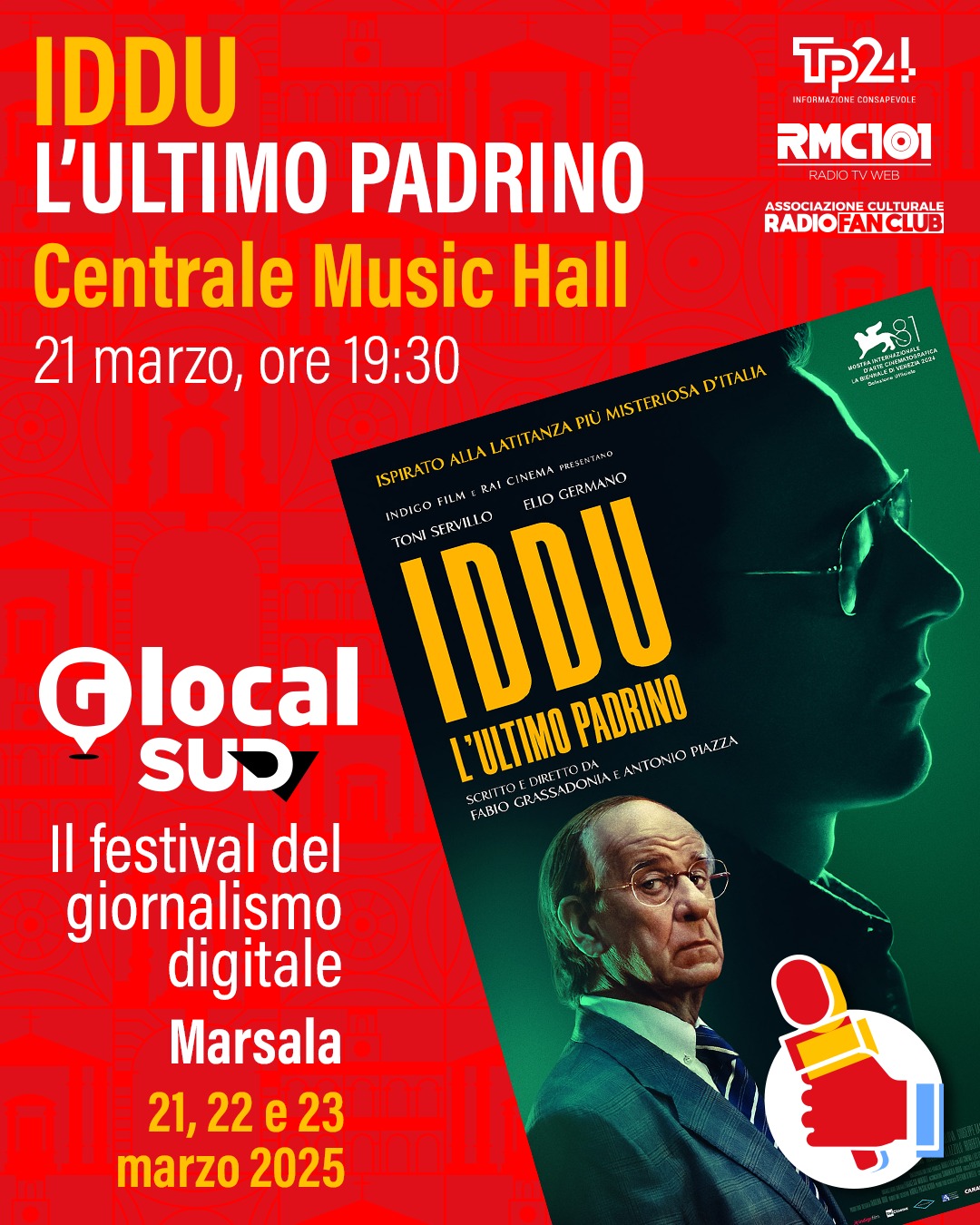 Un appuntamento imperdibile per gli amanti del cinema e dell’inchiesta sociale: venerdì 21 marzo, alle ore 19:30, all’interno del Festival del Giornalismo Digitale Glocal Sud (21-23 marzo, Marsala), si terrà la proiezione speciale di Iddu – L’Ultimo Padrino, il film che ha conquistato pubblico e critica. La proiezione avrà luogo presso il Centrale Music Hall, che per una sera tornerà a essere un punto di riferimento per il cinema d’autore.