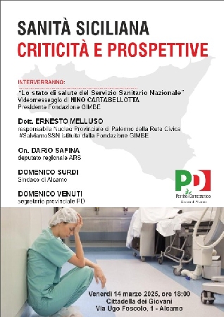 La sanità siciliana sarà al centro di un importante convegno dal titolo "Sanità Siciliana: Criticità e Prospettive", che si terrà venerdì 14 marzo 2025 alle ore 18:00 presso la Cittadella dei Giovani di Alcamo, in Via Ugo Foscolo 1. L'evento, promosso dal Partito Democratico - Circolo di Alcamo, vedrà la partecipazione di esperti e rappresentanti istituzionali per discutere delle sfide e delle opportunità del sistema sanitario regionale.