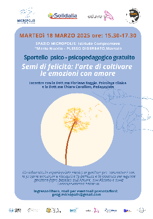 L’incontro è in programma martedì 18 marzo, dalle 15:30 alle 17:30, presso lo Spazio educativo gratuito Micropolis – dedicato ai minori da 0 a 6 anni - di Marsala (Istituto Comprensivo “Mario Nuccio – Plesso Digerbato), ed è realizzato nell’ambito dello Sportello psico-psicopedagogico, un servizio pensato per supportare le famiglie nel loro percorso di crescita emotiva e relazionale.