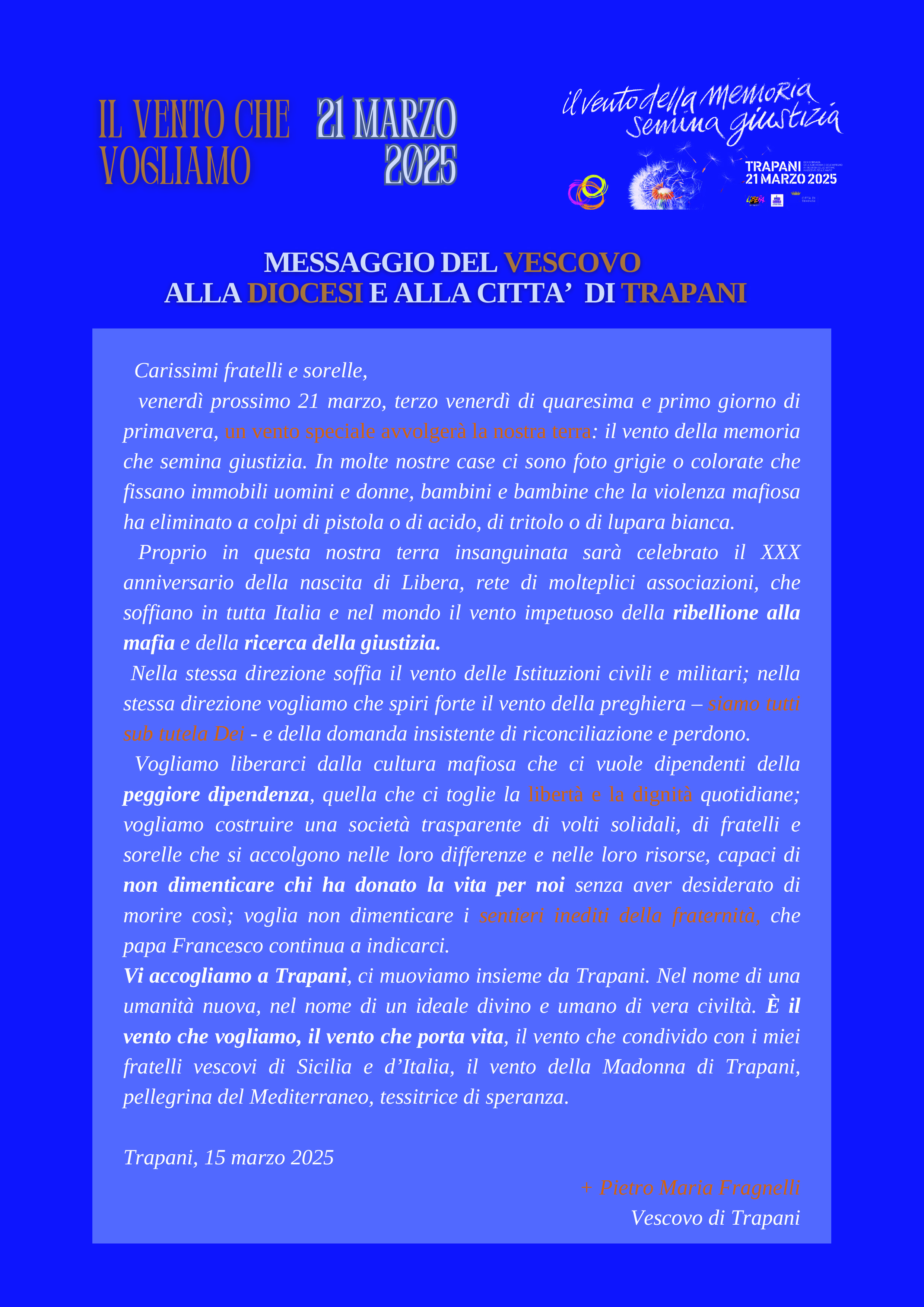 In vista della trentesima edizione della Giornata Nazionale della Memoria e dell'Impegno in ricordo delle vittime innocenti delle mafie, che si terrà a Trapani il 20 e 21 marzo 2025, il Vescovo di Trapani Pietro Maria Fragnelli ha lanciato un forte appello alla comunità ecclesiale trapanese.