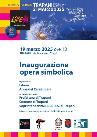 Domani, 19 marzo, alle ore 10.00, nella piazza Vittorio Emanuele di Trapani (via Francesco Crispi) si svolgerà la cerimonia di inaugurazione di un’opera simbolica in onore delle vittime innocenti di mafia. L’evento, organizzato dall’associazione Libera e dall’Arma dei Carabinieri di Trapani, si terrà alla presenza di sua Eccellenza il Prefetto Daniela Lupo, del Questore Giuseppe Peritore, del Comandante Provinciale dei Carabinieri, Colonnello Mauro Carrozzo, nonché delle più alte cariche civili e militari della città.