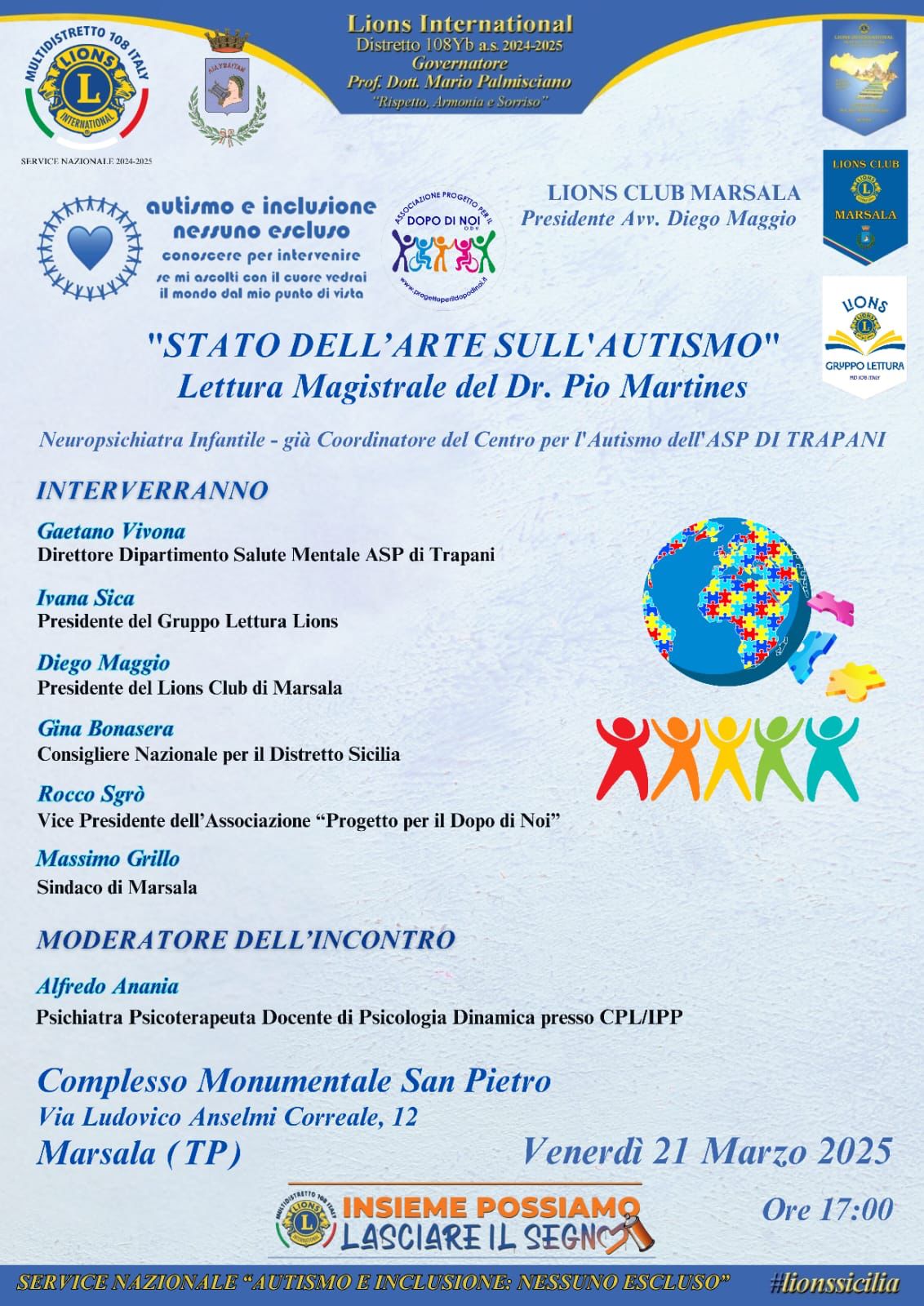L’incontro, organizzato da Mariagrazia Sessa e Gina Bonasera, vedrà la lettura magistrale del neuropsichiatra infantile Pio Martines, già coordinatore del Centro per l’Autismo dell’ASP di Trapani. Interverranno, tra gli altri, Gaetano Vivona, direttore del Dipartimento Salute Mentale dell’ASP di Trapani, Rocco Sgrò, vicepresidente dell’Associazione "Progetto per il Dopo di Noi", lo psicoterapeuta Alfredo Anania, il sindaco di Marsala Massimo Grillo, Ivana Sica e Diego Maggio, presidente del Lions Club Marsala.