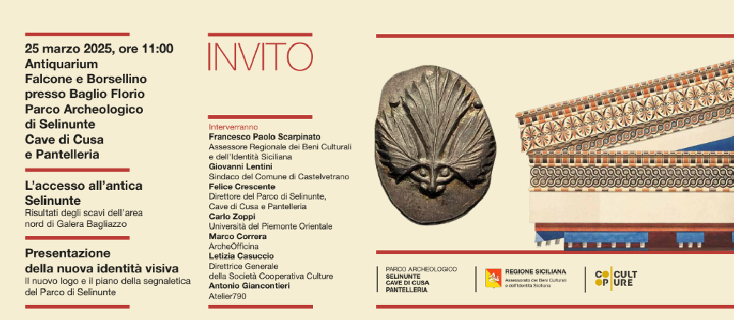 Interverranno anche il sindaco di Castelvetrano Giovanni Lentini, il direttore del Parco, Felice Crescente, Carlo Zoppi dell’Università del Piemonte Orientale e Marco Correra di ArcheOfficina, Letizia Casuccio, direttrice generale di CoopCulture e Antonio Giancontieri di Atelier790 che ha curato la nuova identità visiva del parco archeologico.