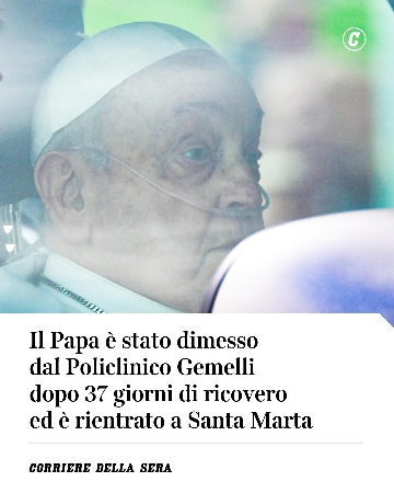• Papa Francesco ha lasciato il policlinico Gemelli dopo 38 giorni di ricovero. Prima di tornare a casa Santa Marta, in Vaticano, ha voluto fermarsi davanti a Santa Maria Maggiore, per lasciare dei fiori alla Madonna