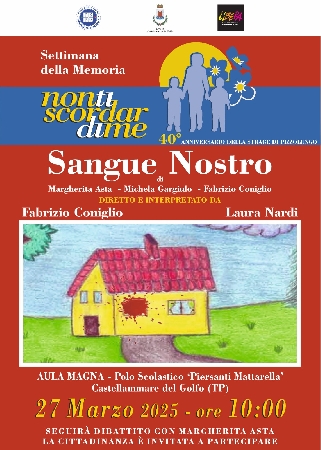 Giovedì 27 marzo , alle ore 10:00, l’Aula Magna dell’Istituto Superiore “Piersanti Mattarella” di Castellammare del Golfo ospiterà la rappresentazione teatrale “Sangue Nostro”, in occasione del 40° anniversario della strage mafiosa di Pizzolungo.