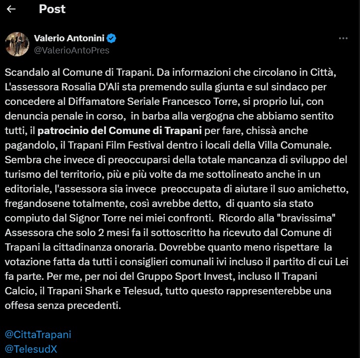 Eppure è proprio questo che accade nel post pubblicato su X, che si apre con un grottesco: “Scandalo al Comune di Trapani. Da informazioni che circolano in Città, l’assessora Rosalia D’Alì starebbe premendo sulla giunta per concedere il patrocinio al Diffamatore Seriale Francesco Torre.”