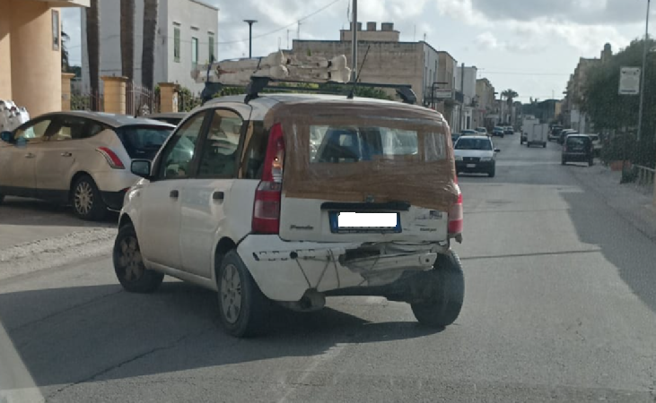 Lo scorso 1° aprile, giornata del "pesce d'aprile", ho incrociato sulla centralissima e trafficatissima via Trapani, all'altezza delle contrade Addolorata e San Giuseppe Tafalia una Fiat Panda bianca, vecchio modello, senza parabrezza posteriore (sostituito da plastica e nastro da imballaggio), senza parafango posteriore destro, con il paraurti posteriore totalmente danneggiato tenuto legato, insomma un veicolo che non potrebbe circolare in quelle condizioni secondo quanto previsto dal Codice della Strada.
