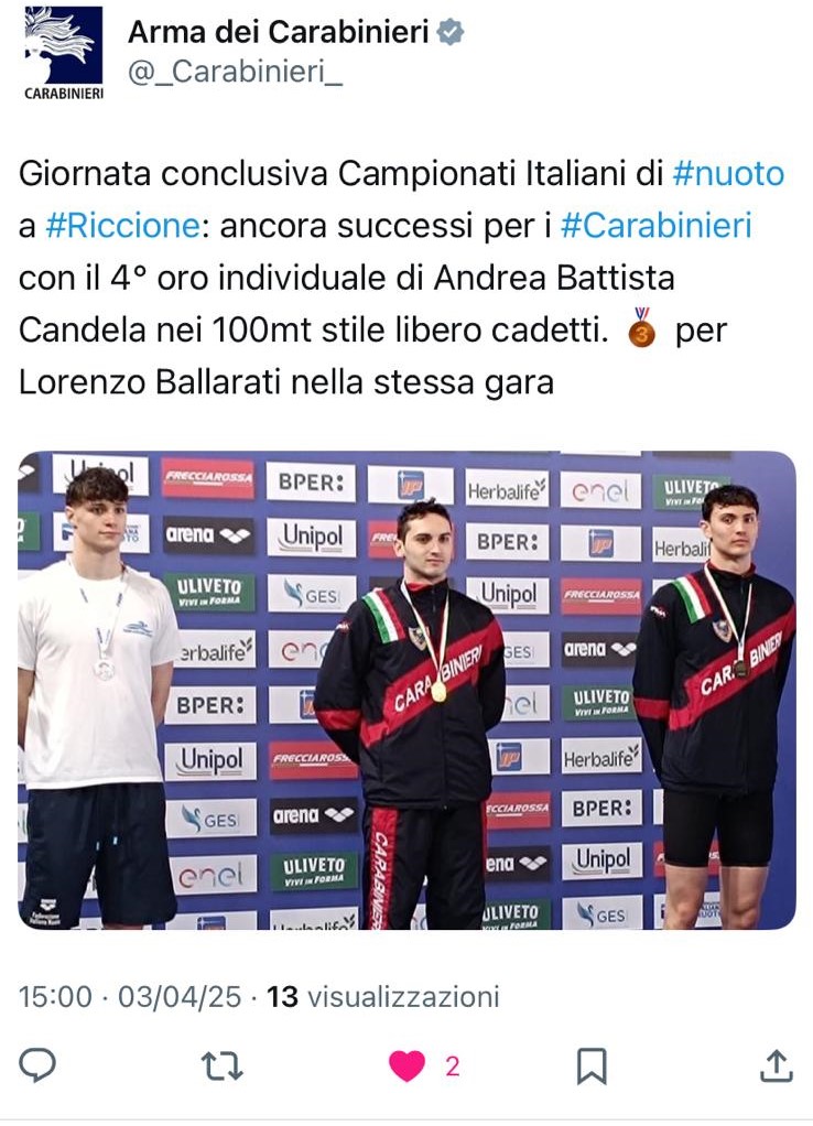 Storica la sua gara regina: i 50 metri stile libero. Con un tempo di 21”20, Candela ha abbattuto il record che apparteneva dal 2009 a Marco Orsi (21”46), guadagnandosi l’ottavo posto assoluto di sempre in Italia nella specialità e i complimenti pubblici dello stesso Orsi. Un risultato che certifica la sua esplosione definitiva tra i grandi, e che lo proietta nell’élite del nuoto azzurro.