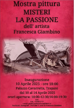 Dal 10 al 14 aprile 2025, le sale di Palazzo Cavarretta a Trapani ospiteranno "Misteri – La Passione", la mostra personale dell’artista trapanese Francesca Giambino. L’inaugurazione è prevista per domani, 10 aprile, alle ore 18:00.