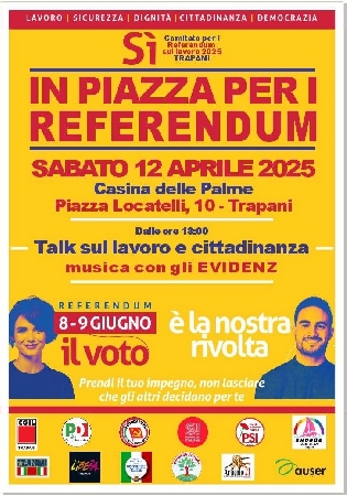L’evento trapanese inaugura una serie di iniziative che attraverseranno il Paese per sensibilizzare i cittadini sull'importanza del voto referendario e per promuovere una partecipazione consapevole e attiva. Al centro del dibattito ci saranno i temi del lavoro e della cittadinanza, affrontati in un talk in cui si alterneranno le voci dei rappresentanti sindacali e dei soggetti collettivi che hanno aderito alla campagna per il Sì.