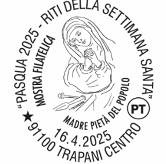 Mercoledì 16 aprile, infatti, sarà attivato un servizio filatelico temporaneo con uno speciale annullo postale dedicato alla celebrazione della Pasqua 2025 e ai suggestivi Riti della Settimana Santa. Il bollo speciale, recante la dicitura “PASQUA 2025 – RITI DELLA SETTIMANA SANTA – MOSTRA FILATELICA – Madre Pietà del Popolo”, è stato richiesto dal Circolo Filatelico e Numismatico Trapanese “Nino Rinaudo e Biagio Gucciardi”, in omaggio a una delle due iconiche statue seicentesche tradizionalmente portate in processione.