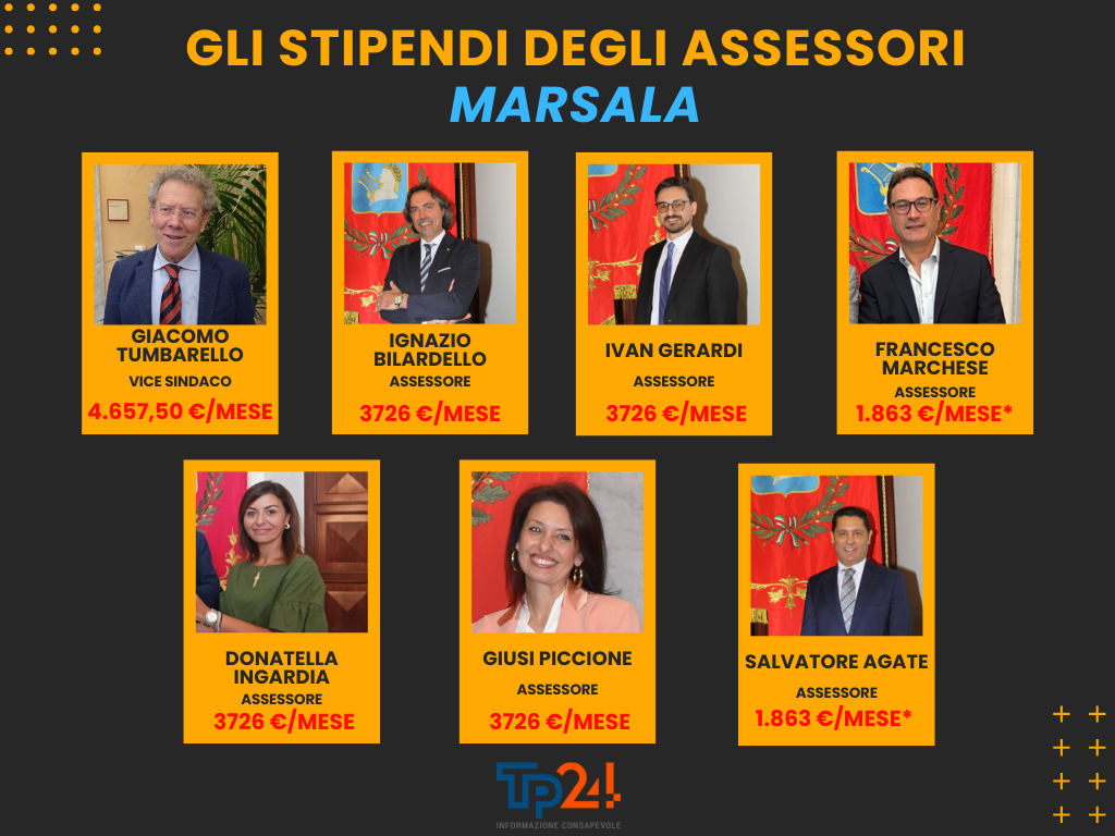 Gli assessori con indennità piena (Gerardi, Bilardello, Marchese, Piccione e Ingardia) ricevono ciascuno 3.726 euro al mese, per un totale complessivo di 223.560 euro l’anno. A questi si aggiunge l’assessore Agate, che percepisce un’indennità dimezzata di 1.863 euro mensili, pari a 22.356 euro annui. L'assessore Marchese, però, fa sapere che percepisce l'indennità dimezzata, quindi come Agate 1863 euro al mese lordi. Bisogna dire, però, che nel prospetto pubblicato dal Comune di Marsala questo non risulta.