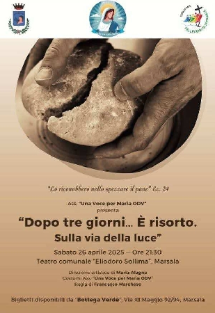 L'associazione "Una Voce per Maria ODV" di Marsala, con la regia di Francesco Marchese e la direzione artistica di Maria Alagna, presenta lo spettacolo "Dopo tre giorni... È risorto. Sulla via della luce".